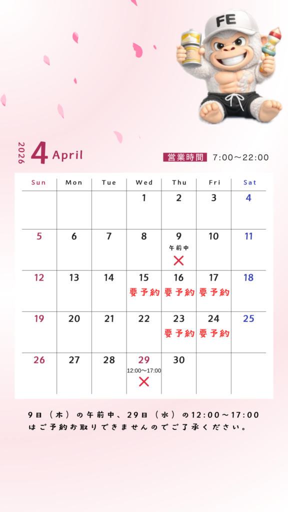 FEの4月の予定です、出張トレーニング、出張マッサージ等の予定があり要予約の日もあります。